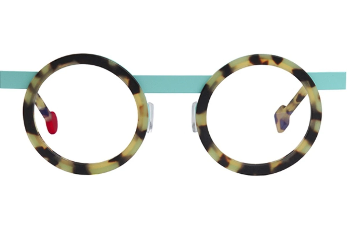Occhiali unici realizzati dal brand Francese Sabine Be con lenti round e ponte a barra, montatura matte Tokyo satin in acetato turchese e tartaruga, terminali con dettaglio a contrasto. Le forme geometriche ed i colori molto accesi rendono questo occhiale unico e stravagante, adatto agli amanti delle montature particolari.